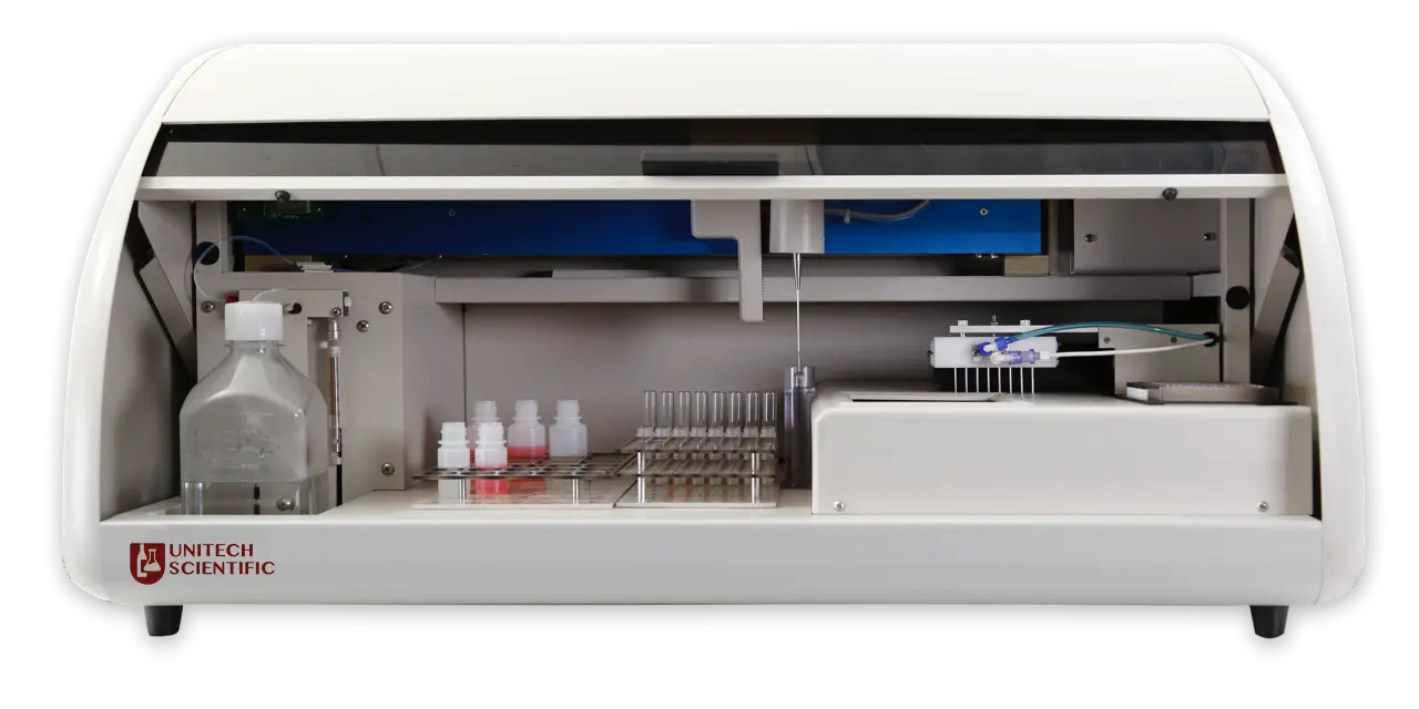 Automatically Calculates results, multiple curve-fitting, Easy to Use. Pre-programed protocols for Unitech kits & standards; Open Software, 60 results / 30-test kits
